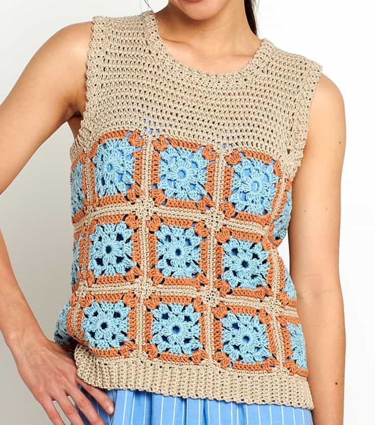 Try this free sleeveless crochet top with granny square details.