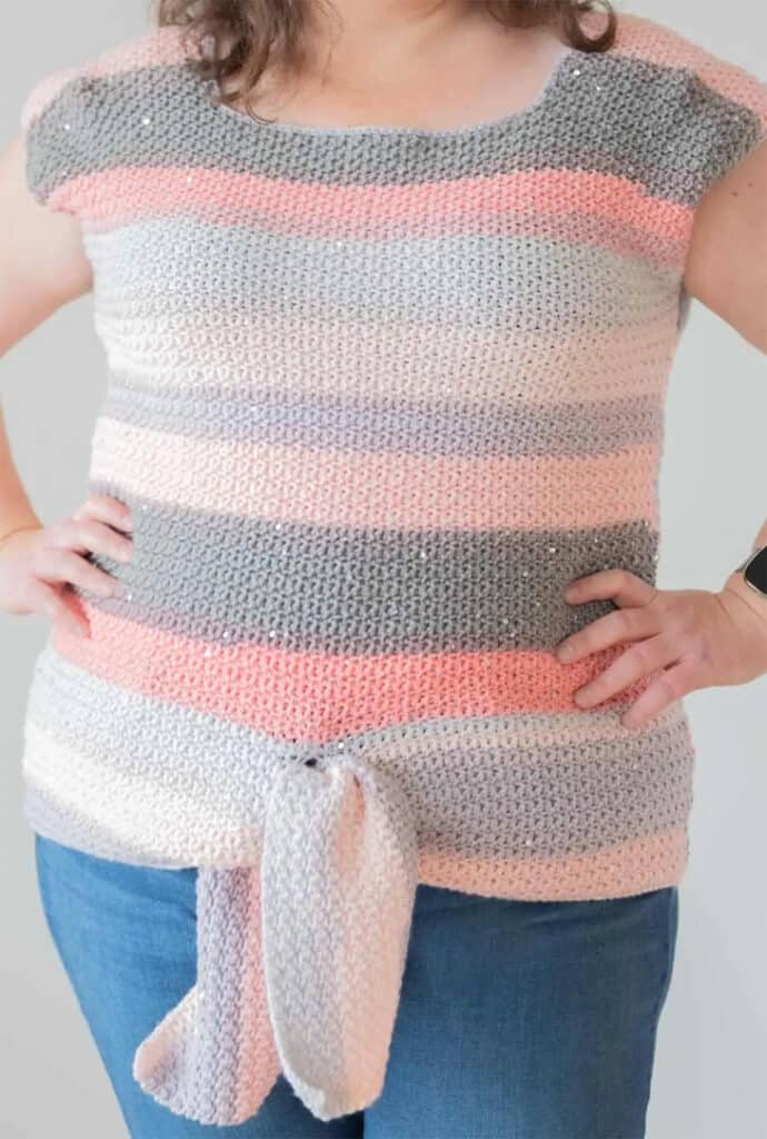 Try this tie front tee crochet pattern with sizes from XS to 5XL.