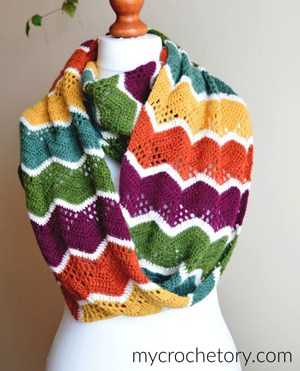 Try the classic ripple in this colorful infinity scarf crochet pattern. This free brightly colored pattern will be an fun addition to your wardrobe.